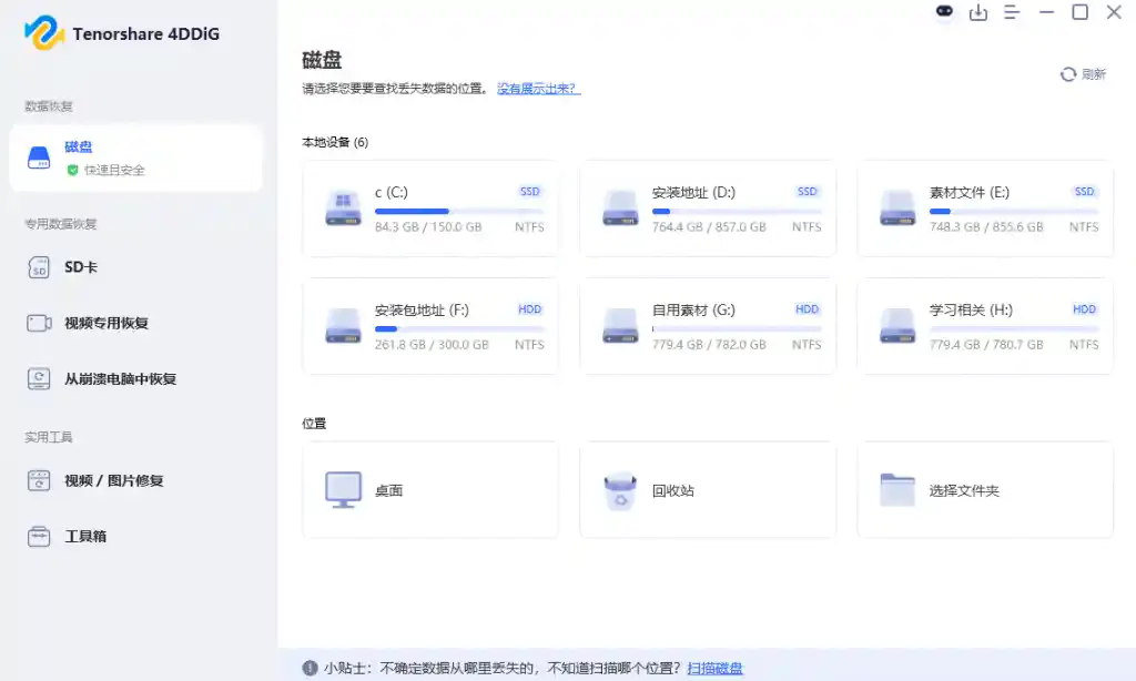 - 4DDiG 的扫描速度快且效果显著,能够深度扫描硬盘、U 盘等存储设备,确保找回尽可能多的丢失数据。